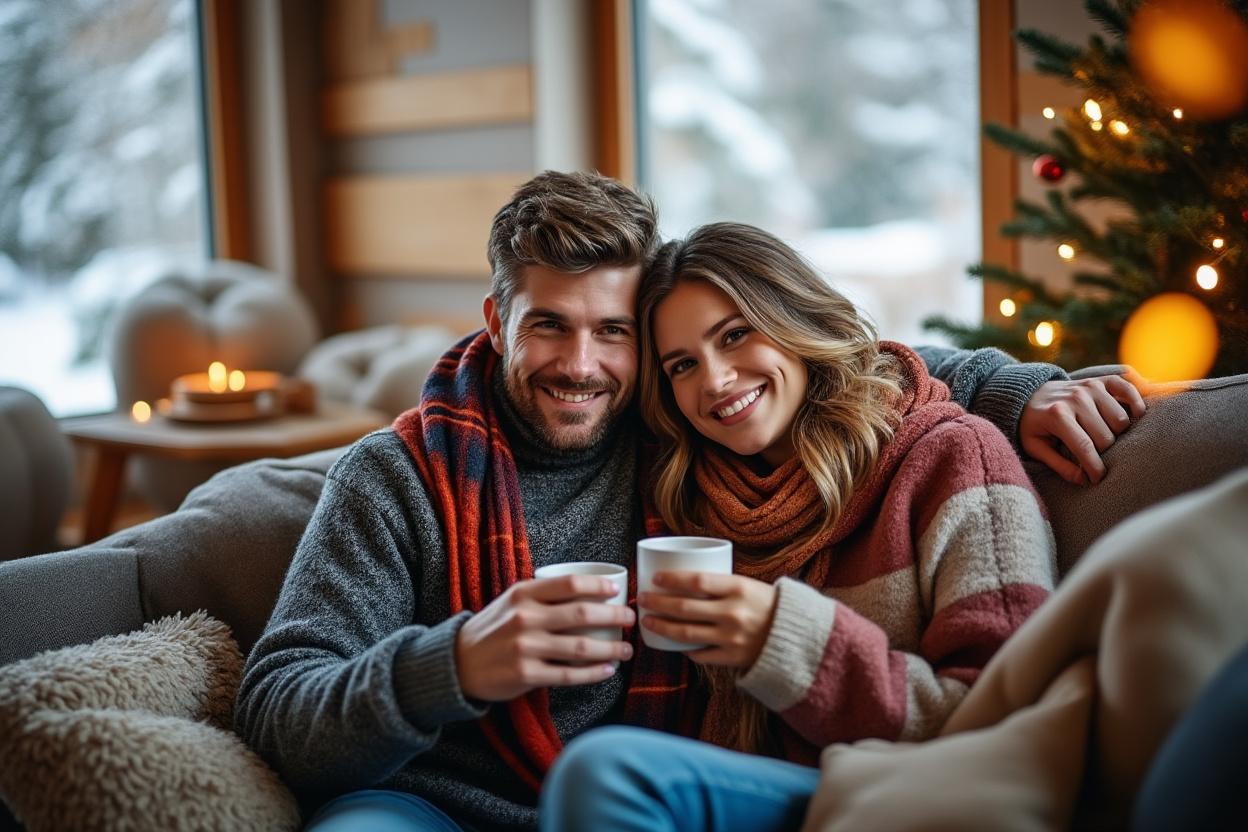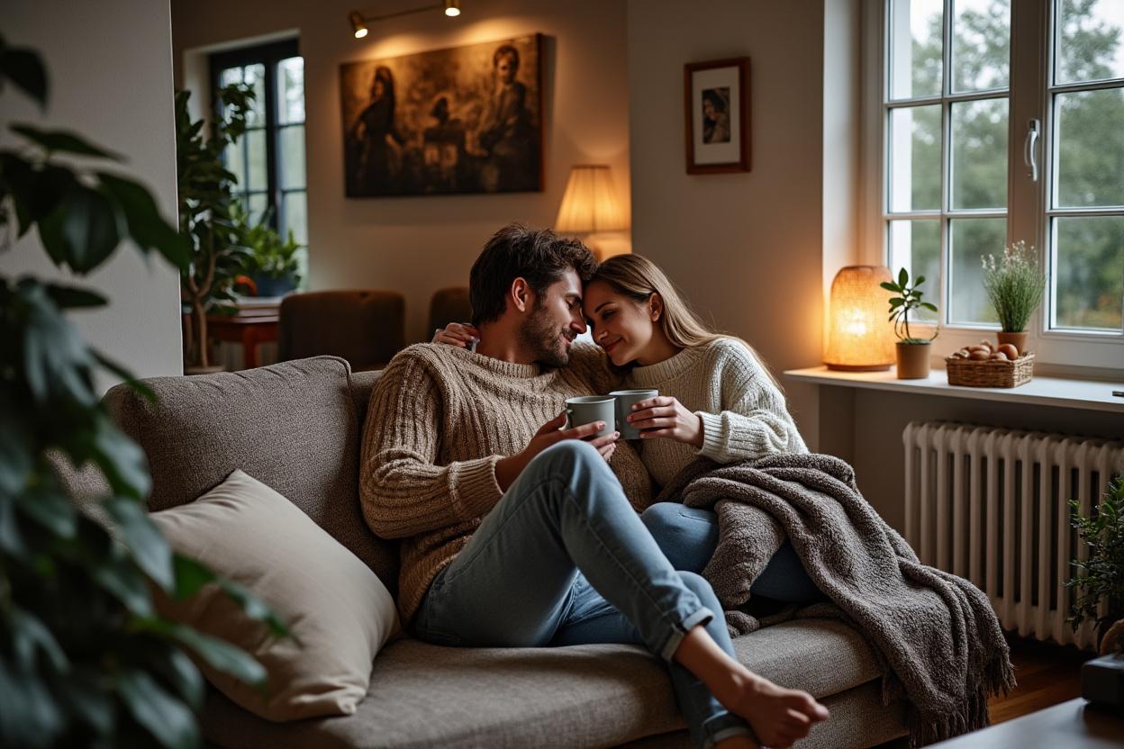 Plaids, chaussettes épaisses, coussins et bouillottes améliorent la sensation de confort à 19 °C sans augmenter la consigne. L’éclairage chaud renforce l’effet.